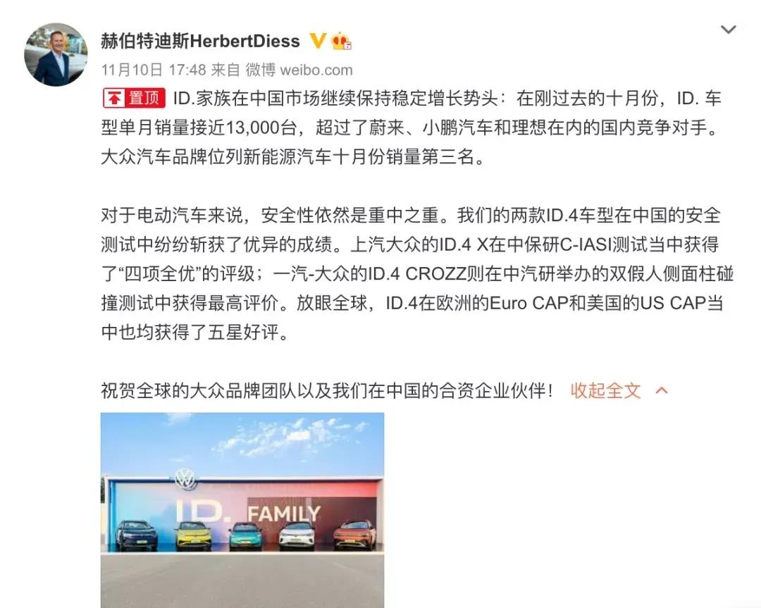 據了解,大眾旗下的德國工廠有茨維考工廠和德累斯頓工廠。而茨維考工廠主要負責生產大眾ID.3、ID.4、奧迪Q4 e-tron和Cupra Born等車型。值得注意的是,早幾日,大眾汽車集團迪斯在社交平臺發(fā)文表示,ID.家族在中國市場繼續(xù)保持穩(wěn)定增長勢頭,十月ID.車型單月銷量為12376臺,超過蔚來、小鵬汽車和理想等國內競爭對手。不能看出此次停產,也將導致這些車輛供應在短時間內受到限制。